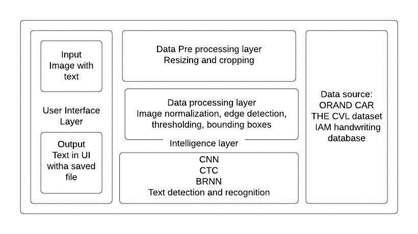 OpticalCharacterRecognition(OCR)dealswithrecognition ofdifferentcharactersfromagiveninputthatmightinclude animage,arealtimevideo,oramanuscript/document.By usingOCR,onecantransformthetextintoadigitalformat, thusallowingrapidscanninganddigitizationofdocuments inphysicalformataswellasrealtimetext recognition(in case of videos) Similarly, this interpretation of OCR methodology involves pre processing of input, text area detection, application of the best pre trained models and finally, detection of text as an output. All of this is made possible with an offline software UI compatible with a Windowsoperatingsystem.