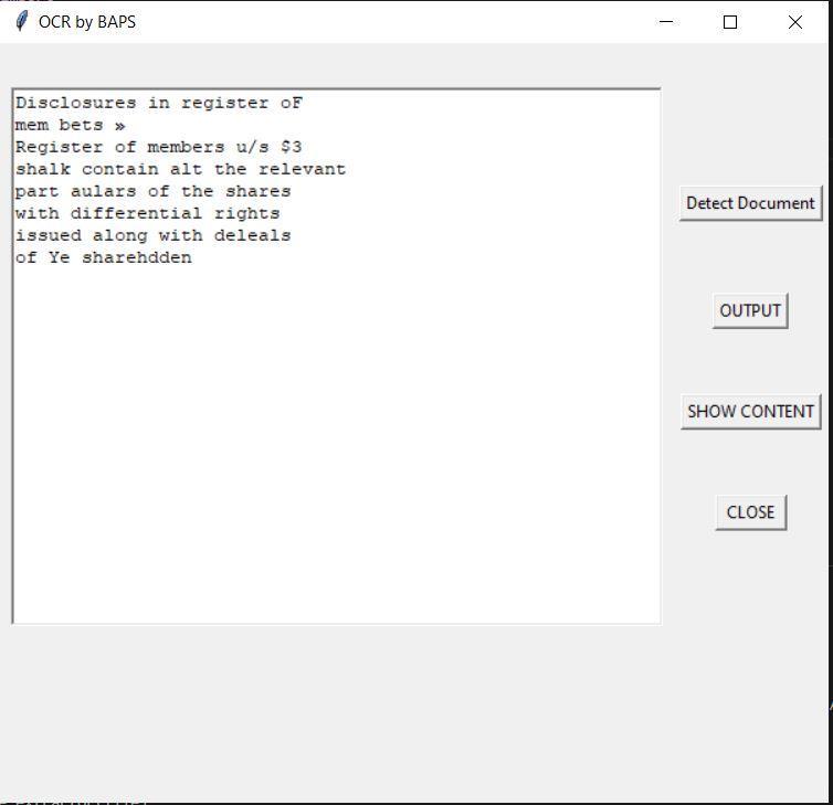 Output: This module stores the text that has been recognizedfromtheimage.Itfurthergeneratesanoutputin theoutputwindowandmakesatextfile.