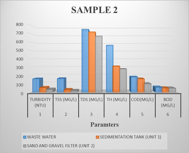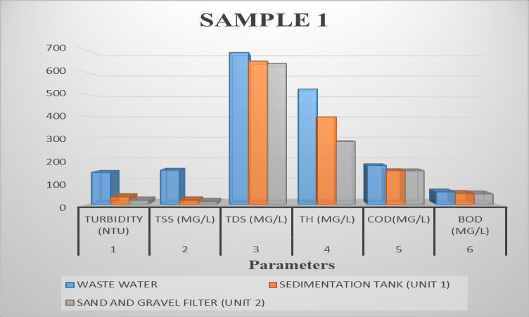 Table 1. Concentration of various parameters at each stage of treatment system. (Sample 1) SR NO PARAMETER WASTE WATER SEDIMENTATION TANK(UNIT1) SAND & GRAVEL FILTER (UNIT 2)