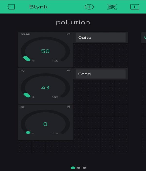menus. The consolidated results from the sensors are available to the users through the developed android application.Theandroidapplicationwasdevelopedinthe Blynkplatform,whichallowsustoquicklybuildinterfaces for controlling and monitoring hardware projects. The result is displayed in the form of gauge widget indicating thelevelsofpollution