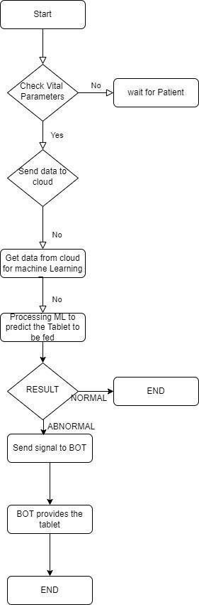 Asshownintheabovefigurethesystemgetsinitializedanditisdescribedinthestart block.Thediamondblock followedbythestartblockisusedtocheckvitalparametersofthepatientandoncethedataacquiredthusacquireddatais senttothecloudserver.Ifthedataisnotacquired,thesystemwillwaitforthedatauntilthedata receives.Thusthedata made available in the cloud server is retrieved and processed through machine learning algorithm and the result is processed which is represented by the diamond box. If the result is normal, the overall process comes to end and it is represented by the end terminal block. Once the result is found to be abnormal, the signal is sent to the robot and it is represented by the process box of flowchart, further robot will provide appropriate medicine to the patient and the processisfinallyterminated.