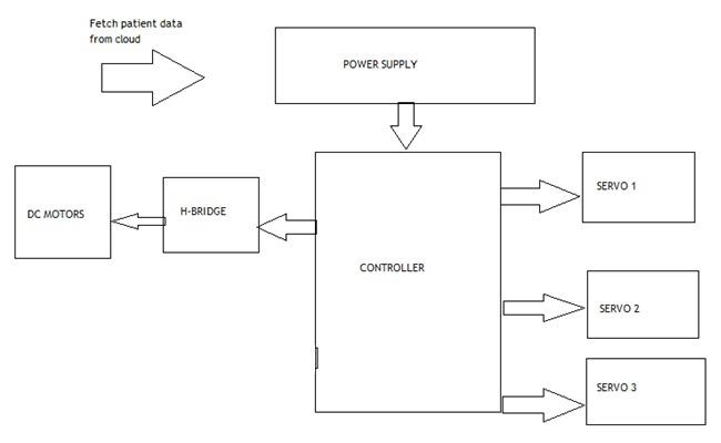 IntheproposedsystemIntegrationofwirelesssensortomeasurethepatienthealthperiodically/continuouslyandsend the data to cloud is performed. By using machine learning technique, the commands are sent to the robotic vehicle. The outputofthesensoriscommunicatedtothecontrolleroftherobotandiscomparedwiththestandardhealthvalues,ifis abnormal then the robot provides medicine to the patient. The patient medication details can also be communicated to familymember/doctorwhenitrequiredemergency.Roboticarmisusedtoservethepills.