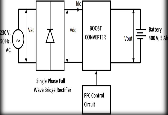AsshownintheBlockDiagramthe230VoltACSupplyisgiventotheBridgeRectifier.TheBridgeRectifierisSingle phase FullWaveBridgeRectifierasitistermedanUncontrolledrectifierinthattheappliedinputvoltageispasseddirectlytothe outputterminalsprovidingafixedaverageDC207.06Volt.TheOutputoftheRectifierisgiventotheBoostConverter.The output voltage of the bridge rectifier is connected to the Inductor the rating of the inductor is 0.3mH. The solid state devicewhichoperatesasaswitchisconnectedacrossthe bridgerectifierwhichisMOSFET.ThegatepulseofMOSFETis givenbythePFCControlCircuitwhichisusedforimprovingthepowerfactoroftheCircuitandtoimprove theefficiency ofthecircuit.Thediodeisconnectedtoa capacitor;theratingofthecapacitoris2000microfarad whichisusedtoripple by smoothing capacitors that convert the ripple voltage into a smoother dc voltage. As aLoad, the battery is used. The ratingoftheBatteryis400 VoltandtheStateofChargeofthebatteryiskeptat30,sothebatterygetschargedupto400 Volt.