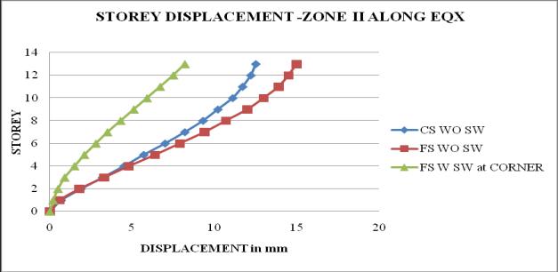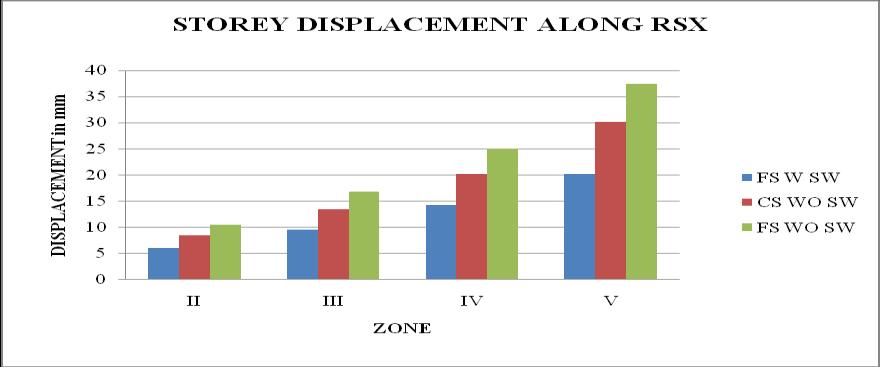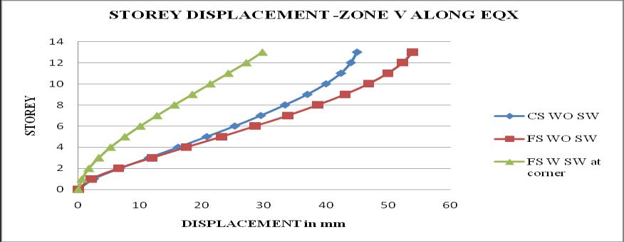 1. The storey displacement is high at the top storey andlessatthebase.Withtheincreaseintheheight ofthestructurethedisplacementgoesonincreases. Storeydisplacementofflatslabstructurewithout shearwallshowsmaximumvalue.