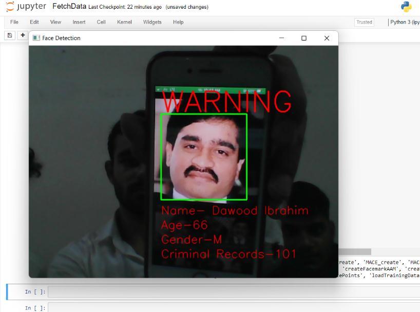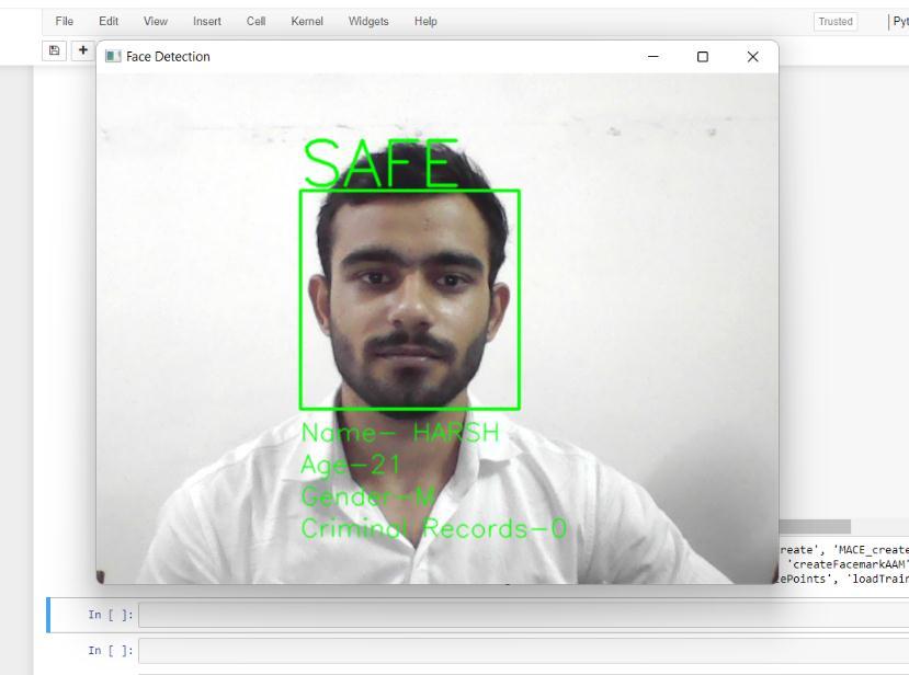 Asaresult,wehavedevelopedasystemthatiscapableof identifying, detecting, verifying the face of a criminal and showingitsinformationafterretrievingitfromthedatabase. Belowaresomescreenshotswhichweretakenwhiletesting andtrainingthesystem.