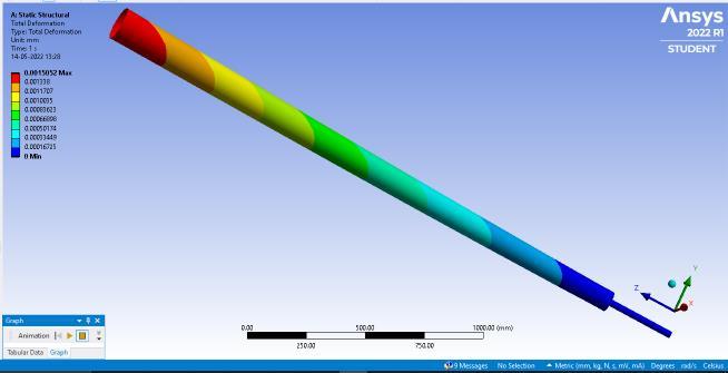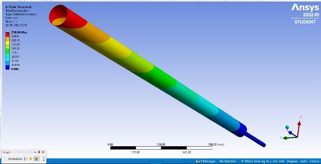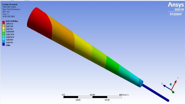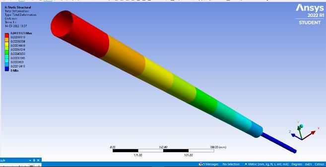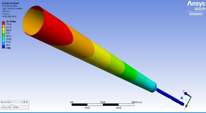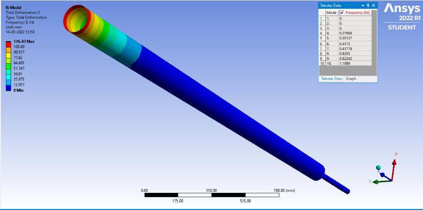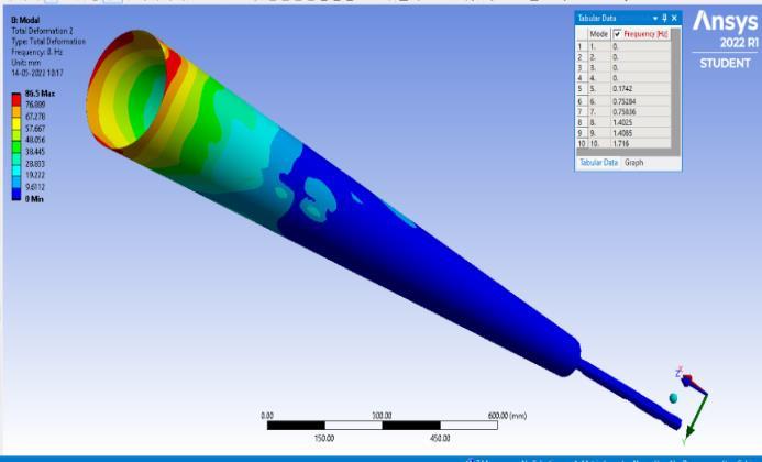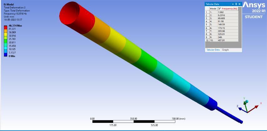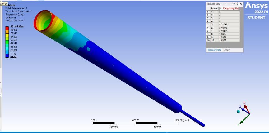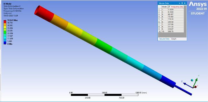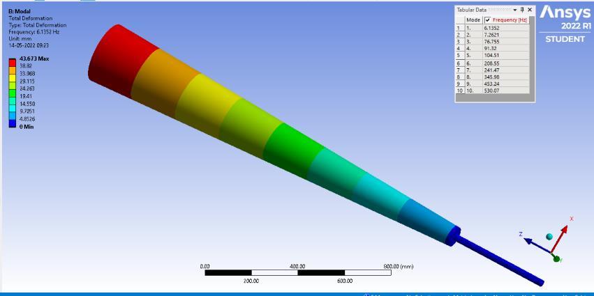 minimizingtheerrorfunctiontoapproximatethesolutionof aproblem.Theboundaryconditionandmeshingisapplied on the models. The boundary condition for the model is settingtheknownvaluesfordisplacementorload.Thetotal deformation values of models with their maximum and minimum deflection are noted in the table [2].Meshing is performed on the model with element size of 20 mm[15]. The different length size of mast and rod are mention in table [1].Along with the parameter like maximum diameter(Dmax),minimumdiameter(Dmin),diameterofrod (d) are also mentioned. The range of modal frequency performedinmodalAnalysisisgivenintable3.Therangeof frequencywassetbetween1to1000Hzfor10modes.The displacementofbottomendofrodisfixedinalldirections andtheaboveportionofthemastiskeptfreetomoveinall directiontohavemaximumdisplacementatthemast.