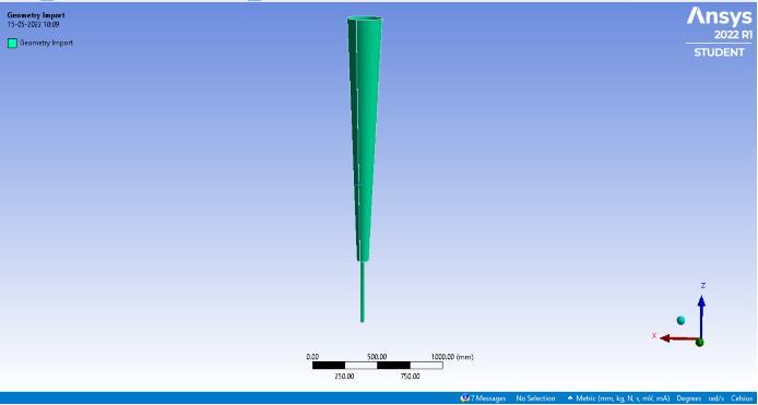 ThemodelisdesignedintheCATIAV5softwareandstp.file isimportedinANSYS2022asshowninFig1.Thisstructure isdesignedinacylindricalconetaperingdownfromtop.A taperedornon taperedcylindricalconstructioncanbeused to represent the vortex bladeless turbine. But the tapered cylindrical structure is the most suitable alternative to supply the vortex shedding property of fluid flow and therefore the oscillation is produced due to its simple aerodynamicshapes[11].