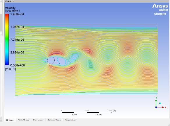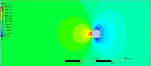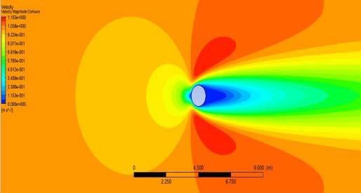 disc.TheFigure3showstheplotoftheliftcoefficientvs.the functionoftime.Thevariationofthedragcoefficientwith time is plotted in Figure 4.When the vortex shedding frequency synchronizes with the cylinder's vibration frequency,themostsubstantialreactionoccurs.Thevortex sheddingfrequencyapproachesthebody'snormalfrequency astheairflowisadjusted.Thiswillsetasignificantamount of vibration energy to the body [8]. The entire vortex structureisplacedintoafluiddomainfortheFluid Structure Interaction study after the von Karman analysis and dimensionfixation.Figure5depictsthevelocityflowfield. Whenairtravelsoverthemast'scrosssectiondisc,avelocity reduction happens in the middle of the downstream and closetoitsplace.Airvelocity,ontheotherhand,increases onbothsidesofthedisc.Subsequentdistributionofpressure is shown in Figure, 6 which is opposite to the velocity distribution.