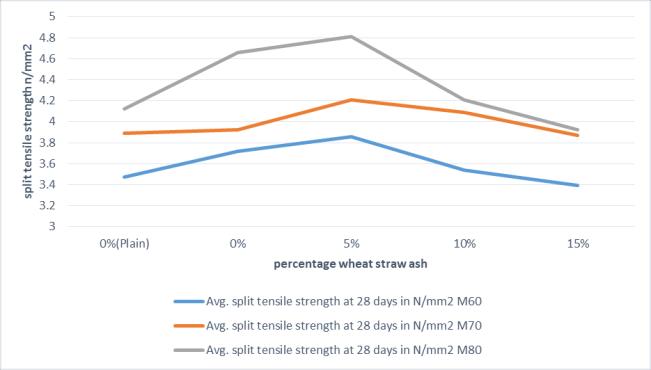 Table 5 shows the results of split tensile strength for differentgradesofconcretefordifferentpercentageofwheat strawash.Fig.4showsvariationinsplittensilestrengthof differentgradesofconcreteagainstthepercentageofwheat strawashat28Days.