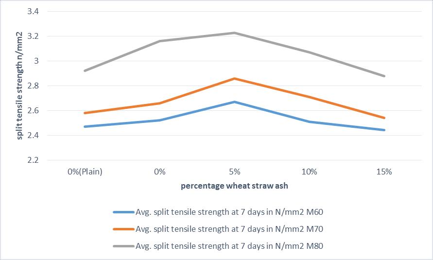 Fig. 3: Variation of split tensile strength (7 days in N/mm2)withdifferentpercentageofwheatstrawash