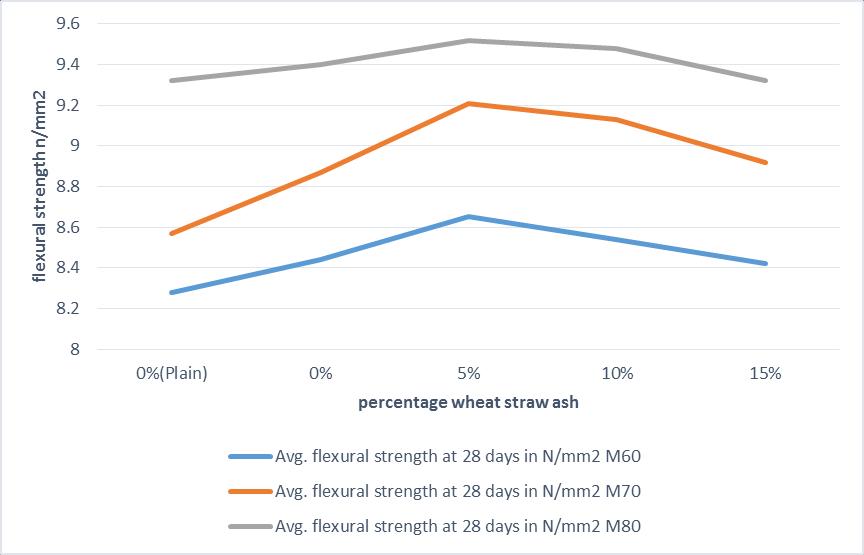 Fig. 6: Variationofflexuralstrength(28daysin N/mm2)withdifferentpercentageofwheatstrawash
