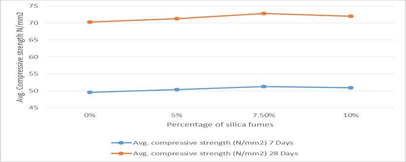 Fig 1: Variationincompressivestrengthfordifferent proportionsofsilicafumes