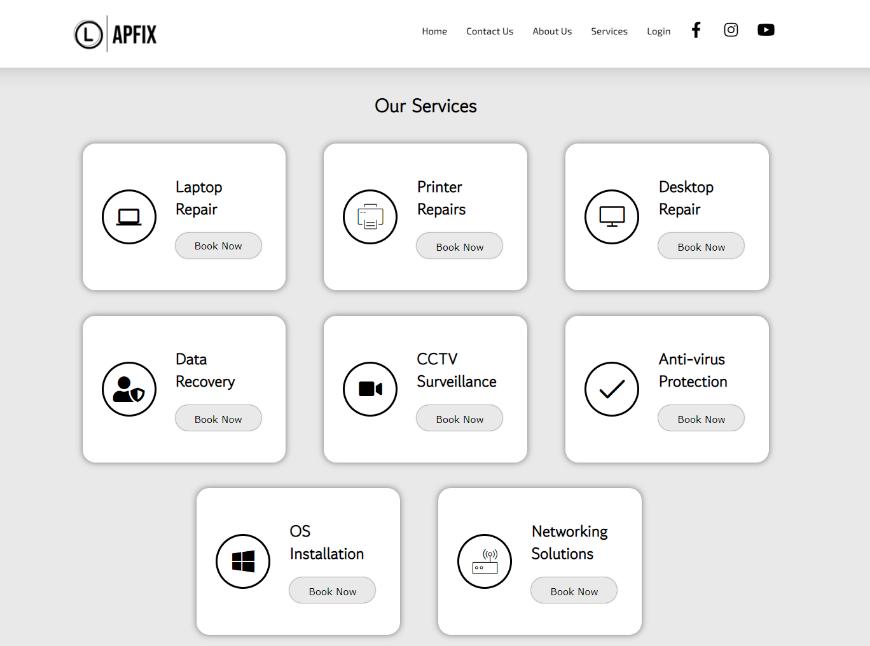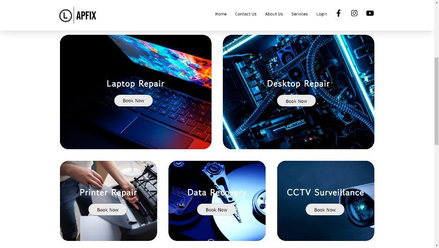 The services page shows all the services which are provided by JB Computer. We have made blocks for every services.Theblockscontainanoverlaybackgroundimageandheadingofthatparticularblockanda“BookNow” buttontobookthatservice.