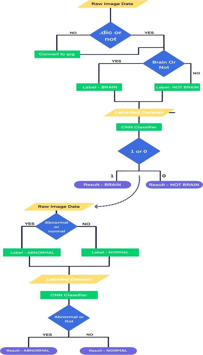 The abnormalities in a brain image require the analysisof specific brain parts. The features of the identifiedparts get compared to conditions that fulfil an abnormal image. The images get labeled as Abnormal and Normal.The labeled dataset movesintothebinaryclassifierfor training. TheCNN model classifies theimageas"ABNORMAL"or"NORMAL"basedonthe learningfromtrainingdata.Thefurtherstepsinclassificationincludemodificationstoimproveaccuracies.