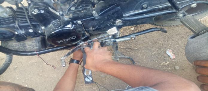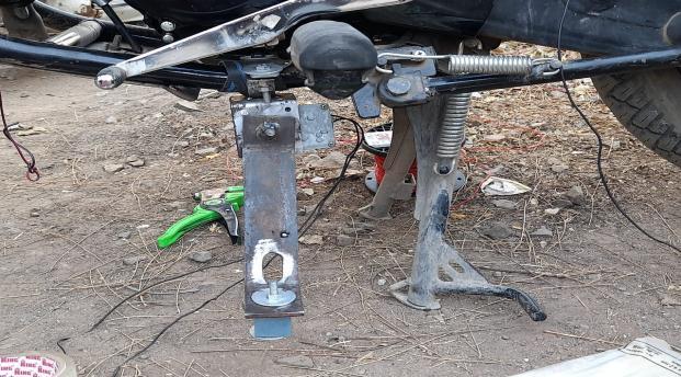 First, she took the angle plate and attached it to the bottomofthechassispipeofthebike.