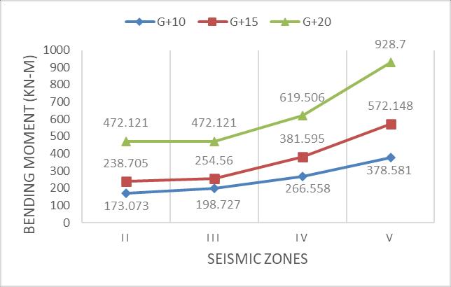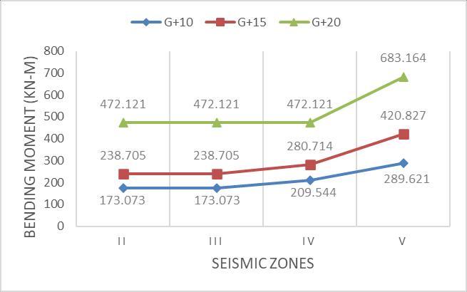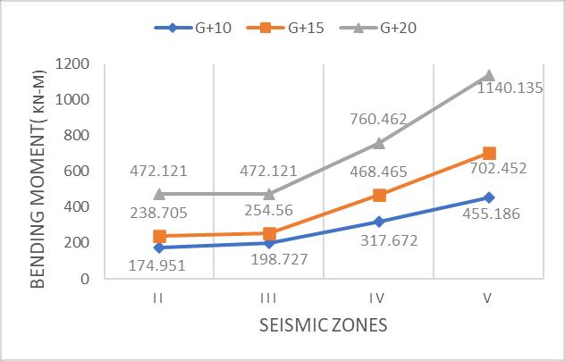 Fromtheabovetables&figures(8to10),itisobserved that for different soil conditions with the increase of seismic zones and the height of building, maximum bendingmomentincreases.Itisalsoobservedthattherate ofincreaseofbendingmomentforG+15,G+10buildings remainsconstantuptozoneIIIandbeyondthattherateof increase of bending moment increases rapidly and for G+20 building the rate of increase of bending moment remainconstantuptozoneIVandbeyondthattherateof increaseofbendingmomentincreasesrapidlyforhardsoil conditionsandforothertwoconditions(mediumandsoft) forG+20building therateofincreaseofbendingmoment remainconstantuptozoneIIIandbeyondthattherateof increase of bending moment increases rapidly and for G+10, G+15 buildings the rate of increase of bending momentincreasesrapidlywiththeincreaseofzones.