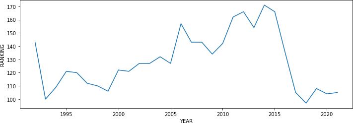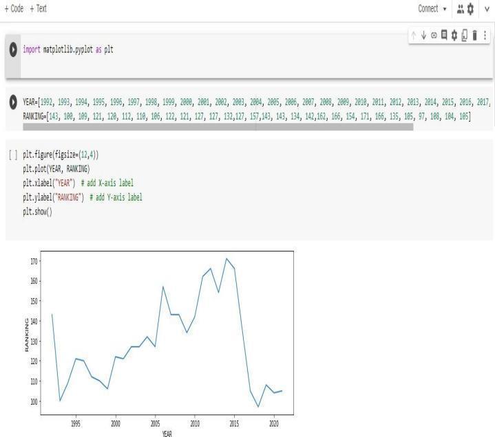 The ranking trend of our Indian team in worldwide football has been drawn in a graphical view usingpythoncode,whichisshowninfigure4.1.