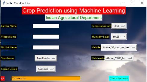 Remaining SMLT algorithms will be involved in finding the best accuracy with applying to predict the crop yield and cost. Agricultural department wants to automate the detecting the yield crops from eligibility process (real time). To automate this process by show the prediction result in web application or desktop application. To optimizetheworktoimplementinArtificialIntelligenceenvironment.