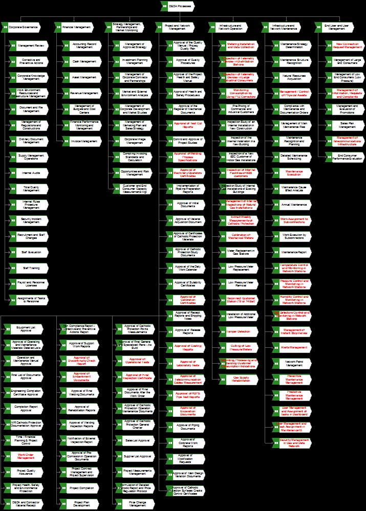 ConcerningtheidentificationofBusinessProcessesinwhich Gas4.0technologiescouldbeused,atotalof44 processes werefound.EachprocesswasanalyzedwiththeaidofARIS architecture using BPMN (Business Process Model and Notation) diagrams, while specific additional architecture diagrams were implemented, in case it was deemed appropriate. 44 interviews with DEDA employees were conductedinthisstageofthemethodology.Theprocesses identifiedarehighlighted(bothinboldandwithredcolour) inFigure2.