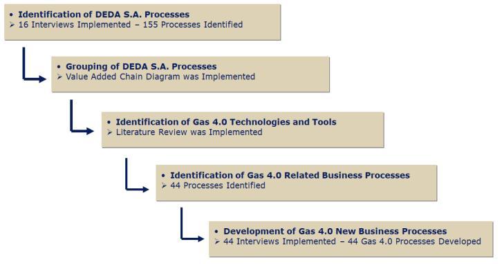 The methodology followed consists of a series of distinct steps.Atthebeginningoftheprocess,themainconcernwas theidentificationandgroupingofDEDAS.A.processes,with theaidofthecompany’sprocessowners.16personaland groupinterviewstookplace,involving11DEDAemployees (processowners),resultinginaValueAddedChainDiagram (VACD). As a next step, a literature review took place in ordertoidentifyGas4.0technologieswhichcouldapplyand improveDEDA’sbusinessprocesses.Theliteraturereview focused exclusively on the Natural Gas industry, trying to identify technologies that could be used. Subsequently, business processes in which Gas 4.0 techniques could be adoptedwereidentified.Literaturereviewandinterviews’ results were combined in order to identify candidate businessprocesses.Finally,anefforttookplacewiththeaim ofplanningthefuturesituationregardingthe44 business processeswhichhavebeenidentified.44personalandgroup interviewstookplace,involving25DEDAemployees(senior executivesandcompanyofficers).Intotal,60personaland groupinterviewstookplace.Figure1depictsthesuggested methodological steps to be followed regarding the methodologydevelopment.