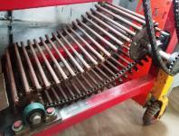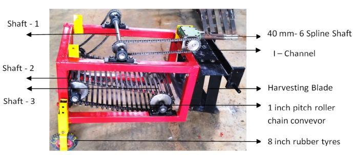 Thisconveyorisusedinthisharvestingmachineto conveythesoilandpotatomassfromthediggingbladeto the field. Also, it separates the soil and potatoes while conveying.Potatoeswillneverdropinsidetheconveyorgap becausethechaingapwasdesignedandfixedaccordingly. Here, K2 attachments with 1" pitch roller chains of 10m lengthareusedforconveyorfabricationanditisshownin Figure5.25mmmildsteelflatsof96numbersareusedto connect K2 attachments in the chain on both sides to performtheconveyingoperation.Initially,thesemildsteel flats are fastened using screws with lock nuts. After conductingmanytrialtests,itwasobservedthatscrewsand nutsweregettingloose,soflatswerereplacedbydiameter 12mmmildsteelrodsandtheywerewelded.Thisconveyor hastwoshafts,namelyShaft 2attherearsideandShaft 3at thefrontside.Adiameterof1inchmildsteelshaftof550 mmandadiameterof4inchhardenedsteelsprocketwheels of4numbersareusedintheconveyorsystem.P205Bearing unitsof6numbersareused.Furthermore,allbearingunits arehorizontallyadjustableviaslotsinthechannels.8inch rubber tyres of two numbers are used to support the harvestermachine,anditisplaced600mmwideinbetween accordingtothefurrowdistance.