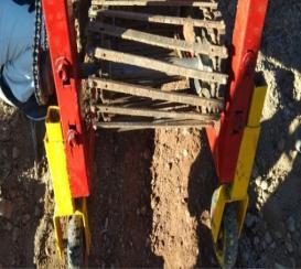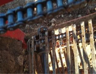 Approximately 25 trial runs were conducted in a fieldwithhardsoilatanapproximatelengthof330feet.It was noted that 25 mm mild steel flats are missing and misalignedduetolooseningofscrewedfastenersrunningat highspeeds,anditisshowninfigure7.Also,somepotatoes remainunexposedwhiledigging.Inordertoovercomethe above mentioned problems, mild steel flats were welded permanently in the roller chain K2 attachments and the dimensionsoftheharvestingbladeswereslightlyalteredto digallthepotatoeswithoutanydamage.