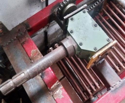 A 1:1 right angle bevel gear box attached to this harvestermachinetorotatetheconveyorisshowninfigure 4. The 40mm hardened mild steel rod with 6 splines is attachedtothegearboxasaninputshaft.Thisinputshaftis connected with the tractor's Power Take Off (PTO) shaft through a PTO joint. Basically, the PTO shaft in a tractor
