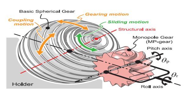 Thismechanismbasedontwoinnovativetypesofgears whichareCS gearandMP gear,CS gearissupportedbya holder and two driving modules of an MP gear .The MP gear has a unique tooth shape that meshes with the CS gear and is driven with two RDOF by the driving module .Thus, this mechanism is driven by four motors. If applied toarobotarm,theholderandthetwodrivingmodulesare fixedtothesamelinkBontherootside,andtheCS gearis fixed to link H on the end side. Consequently, the mechanism operates like an active ball joint with three RDOF between links B and H It enhanced by interactions of spherical gears. The gear based joint drives three rotational degrees of freedom without slippage which is a common problem which face the majority of previous projects. The capabilities were inspired by the unique interactions between two different gears [the cross sphericalgear(CS gear)andmonopolegear(MP gear)]and the superimposition of those interactions by the CS gear's quadraturesphericaltoothstructure.