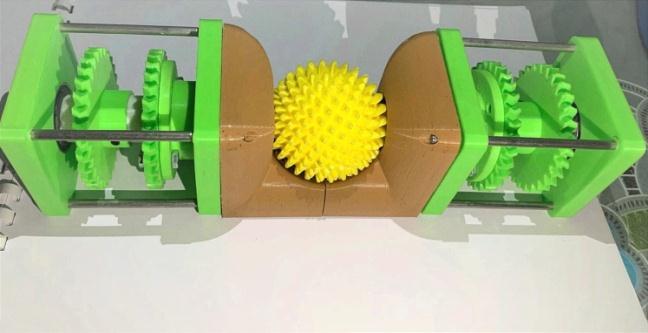 TheCS gearofthe prototypemustbeheldbya holder. Therefore,ifthereisanoutputaxis,therangeofmotionis limited, Such systems can be found in a friction wheel, a spherical motor, and an ultrasonic system. On the other hand, a linkage or differential mechanism has no such limitations. One wayto increase therangeof motionis to remove the bottom part of the opposite type prototype’s holder. Thisreducesthecontactarea betweentheCS gear andtheholder.Thus,thestiffnessisoneofthechallenges, but it allows for a range of motion of 360, 90, 360 [deg]. Another way is to design the angle between the driving modules to be small. The prototype’s angles are 90 and 180 [deg] but can be placed at a minimum angle of 60 [deg]. If a mechanism to prevent the CS gear drop out is installedandtheoverhangisremovedfromtheholder,the range of motion in this mechanism will be extended to approx.180, 180, 360 [deg]. We expect that the linkages, magnets, or mobile spherical shells provide auxiliary holding for the CS gear. Holding the CS gear in a passive gimbal mechanism is one valid method. However, the singularity of the linkage mechanism will be an issue. On the other hand, a combination of a CS gear containing a ferromagnetic material and a holder with permanent magnetsisanalternative.Inthiscase,weneedtoconsider thefrictioncausedbymagneticforcesandthepermissible load of the hand. However, the configuration of the mechanism is relatively simple. In addition, there is one option to hold the CS gear with a movable spherical shell structure Although many challenges are foreseen in this design, it is possible to hold the CS gear with surface contact.Therearemanychallengesindesigningtheholder, but due to the flexibility of its design, we believe our graduationprojecthasahighpotentialforthenearfuture.
