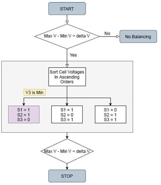 andtheminimumVoltageisgreaterthan 2%itsassumed that cells are imbalanced and balancing protocol will be executed ad system will go into balancing state. Now the system will monitorVoltage of each cell and based on the logicprovideditwillarrangethecellin ascendingorderon theirvoltages.Fromtheflowchartabovelet’sassumethat cell1hasthelowestvoltage(orsaySOC)inthiscaseother twocellsshouldbedischargedunlessanduntiltheirSOCis equivalenttothethirdcell(approximateErrorof2%).For this to happen system will ON the switch 2 and switch 3 whichwillconnectcell1andcell3toshuntresistorwhichis connectedinparalleltocell.Theresistorwilldischargethe cellbygivingoutchargeinformofheat.Meanwhilesystem willkeepcheckingtheSOCdifferenceoncethedifferenceis below2%balancingsequencewillstopandalltheMOSFET willonOFFstate.