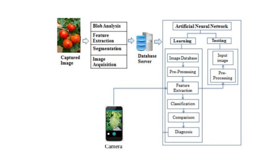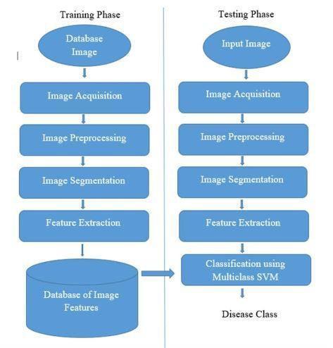 In order to build a machine learning model the figure consists of two phase namely testing and training phase where the model is first trained and an input is given to test the model which is called the test data. The model consists of several image processing steps such as image acquisition, image pre processing, segmentation, feature extractionandSVMclassifiertoclassifythediseases.