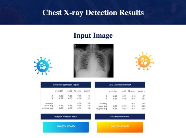 Furtheraftertheuseruploadsthex rayortheCTscanthe CNNModelsprocessingisdoneandifit’smorelikelytobe uninfectedthenprobabilityinpercentageisshownonthe page by both VGG and Inception. it’s found infected then thepositiveresult isalsoshown.