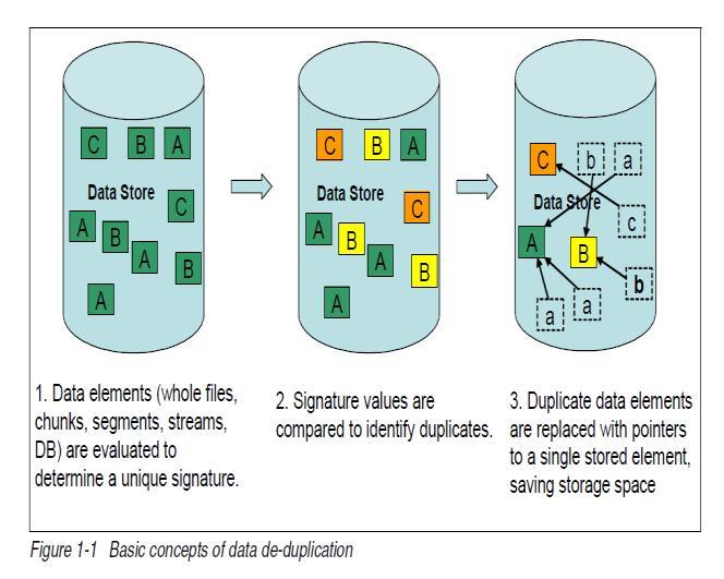 With the help of data de duplication on our storage environment, only one and unique copy of data is retained onstoragemedia,andredundantorduplicatedataisplaced withpointertouniquedatacopy.Thatis,itlooksatthedata onasubfileorblocklevel,andattemptstodetermineifitis seenthedatabefore.Ifithasnot,itstoresit.Ifithasseenit before, it ensures that it is stored only once, and all other references to that duplicate data are mere pointers. De duplicationprovidesthebenefitssuchasincreasednetwork efficiency, bandwidth efficiency and storage efficiency, improved speed replication, reducing backup window and therebycost.