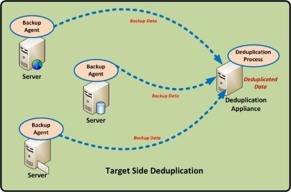 Target de duplication provides faster performance for big datasets. This de duplication can be used for protecting large SQL or Oracle databases. Target de duplication can integrate with the existing infrastructure of the backup system. This de duplication reduces the consumption of primary storage resources. Advantages of target de duplication