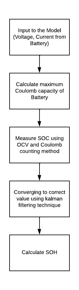 Once the value of the SoC is found by using both the methods mentioned above, we use a Kalman Filter model to check which output is the best for our application.Asshown inthe diagram below, firstthe data is collected and then SoC is found as a function of both current and voltage. Then these 2 values are comparedandthebestisthengivenattheoutput.