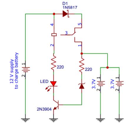 The batteries charge when the relay is in its non energized state, so to stop charging the cells, the relay mustbecomeenergizedwhenthevoltagedropacrossthe cells reaches 8.4V. To prevent the relay from energizing before then, the ground terminal is connected to the collector of a transistor whose base is connected to a Zenerdiode,aSchottkydiode,andaresistor.