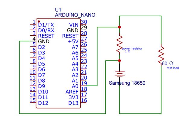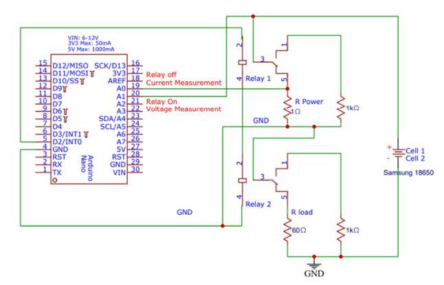 Relay Off: Current Measurement: The battery is connected to load and discharges through R Power. Arduino measures the voltage drop across R Power by measuringthedropbetweenA0andGND.