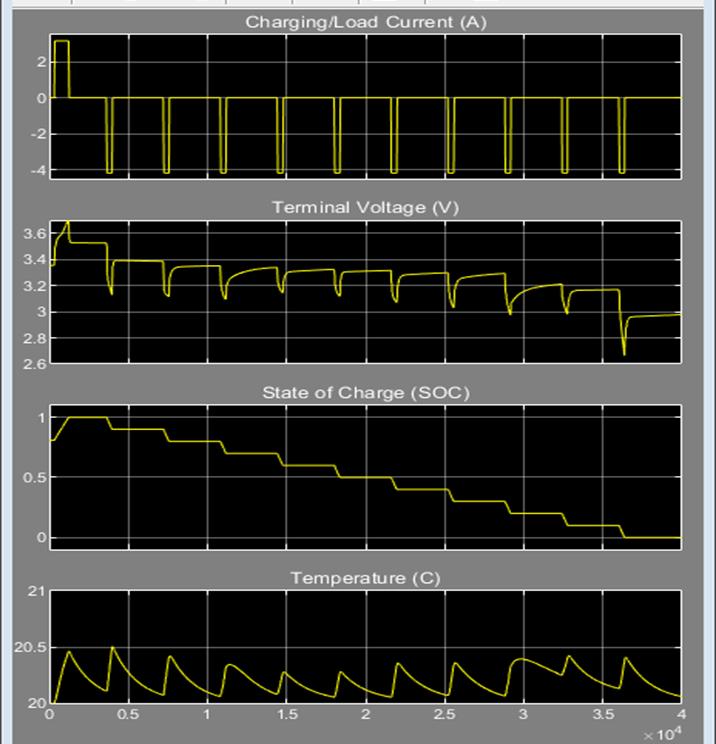 relation to the state of charge to avoid thermal runaway. In order to improve their performance, Li ion batteries, whichprovideprospectivesolutionstoHEVs'energyand power density demands, require a good thermal management system. The goal of this work is to create a battery pack model that looks at how internal resistance changes as a function of temperature.[4]A battery management system (BMS) is a system that controls the operationofarechargeable battery(cellorbatterypack) by preventing the battery from exceeding its safe operating limits and monitoring its state of charge (SoC) and condition of health (SoH). BMS has been a vital component of hybrid and electric vehicles (HEVs) for many years (EVs). With run time battery monitoring for any critical hazard circumstances, the BMS ensures the system's and user's safety. The design and simulation of BMS for EVs are presented in this paper. The whole BMS model, as well as all other BMS functional blocks, are implemented in the MATLAB R2012a Simulink toolbox. The Neural Network Controller (NNC), Fuzzy Logic Controller(FLC),andStatistical Model aretheBMSgiven in this research study. The testing results are used to extract the battery parameters needed to construct and simulate the BMS, which are then incorporated into the model. The SoC is estimated using the Neuro Fuzzy technique, which is utilized to mimic the electrochemical behavioroftheLead acidbattery(chosenforcasestudy). TheStatisticalmodelisutilizedtoaddresstheSoHofthe battery. The findings of the battery cycle tests were used for initial model design, Neural Network training, and later, BMS design and simulation using Simulink. ExperimentsandMATLAB/Simulinksimulationsareused to validate the simulation results. This model has a SoC accuracyofabout97percentandaSoHaccuracyofabout 97 percent.[5]The qualities and performance of batteries under various operating situations are critical in their applications, particularly in the field of electric vehicles (EVs). It is possible to forecast and optimize battery performance using an accurate and efficient battery model,particularlyinpracticalruntimeapplicationssuch asBatteryManagementSystems(BMS).Beforebuildinga solid battery model, an accurate method for predicting battery parameters is required. For battery modeling, three well known battery models are often used: the Partnership for a New Generation of Vehicles (PNGV), Thevenin, and the second order Battery Model. For the prediction of three battery models, a new technique of parameter estimation was developed utilizing the Matlab/Simulink® parameter estimation tool. A 12Ah 3.7V Lithium Polymer (Li Po) battery is put through a series of conventional tests at various states of charge (SoC), temperatures, and current rates, and the three modelparametersareestimatedbasedontheresults.The spreadsheet approach for PNGV battery parameter estimateiscomparedtothe Matlab/Simulink methodfor parameterestimation