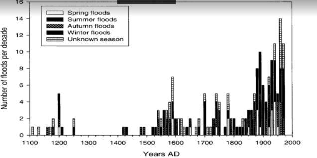 Fig 2:Temporalvariabilityandseasonaldistributionof thenumberoffloodsperdecaderecordedfortheTagus RiverBasinoverthelast1000years. (Source:DOI:10.1023/A:1023417102053)