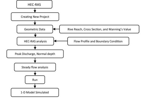 Darshan J. Mehta et al. (2021), stated that because the research area was prone to flooding, a one dimensional (1 D) hydrodynamic model was used to assess the geomorphic effectiveness of floods in the Ambica river basin in South Gujarat. Major floods occurred in 1981, 1984, 1994, 1997, 2001, 2003, 2004, 2006, 2013, and 2014. The purpose of this research was to evaluate the flood depth in the Ambica River basin's delta portion at Unai village using a 1 D hydrodynamic model. In this work, the HEC RAS (6.0.0) programme was used to developa1 Dhydrodynamicmodelusingthegeometryof theAmbicaRiver,theUnaifloodplain,andhistoricalflood data. Fig 1 depicts the methodology of research. Stable flowanalysis,floodconveyance,anduniformflowanalysis were all evaluated using the model. The result of the model wascalculatedintermsofwaterdepthandsurface height. The findings suggested that the low lying areas of Navsari city were vulnerable to flooding when the river discharge surpassed 6500 m3 /s. This research could be used to make judgments on disaster management, flood management, early warning systems, and infrastructure development.