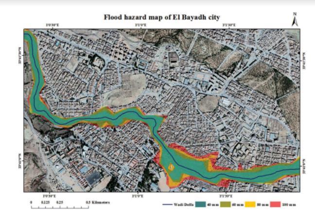 m, 80 m, and 100 m. For the hydrological study required for this project, software such as ArcGIS and HEC RAS were utilized. Figure 5 shows the flood hazard map for different amounts of rainfall in El Bayadh city. When combined with meteorological alerts supplied by the National Office of Meteorology, the flood hazard map generatedthusfarhasshowntobebeneficial.