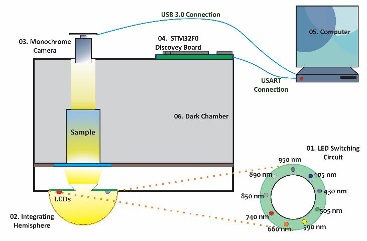 This camera can capture images in the 350 to 1080 nanometerspectralrange.Alaptopwasusedtocapturethe image and send commands to both the discovery board (STM32F0DISCOVERY) and the monochrome camera (MSI GE626QD). In the portable dark room, an LED switching circuit made up of nine off the shelf LEDs was fitted. An integrating hemisphere made of aluminum with a 130mm innerdiameterwasusedtoofferbetterilluminationforthe sample.AlocallymanufacturedACregulated12VDCpower supplyunitwasusedtogivestablepowerinputtotheLED driverICs(MAX16839ASA+).InfrontoftheLEDswitching circuit,thecamerawaspositioned.