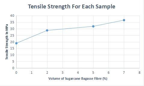 increaseswithincreaseintheconcentrationofthebagasse fibre.Compositecontaining7%ofbagassefibrehashigher ultimate strength or higher breaking point than 5% and the composite containing 5% of bagasse fibre has higher ultimate strength than 2% and so on . Therefore we can conclude from the result that the tensile strength of a composite increases with increase in the concentration of thefibrepresentinthecomposite.