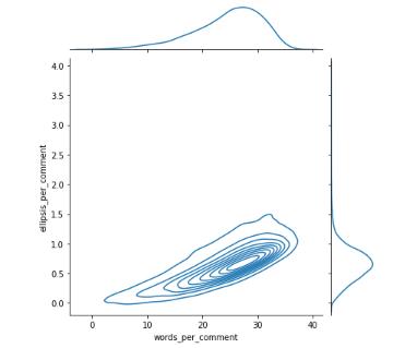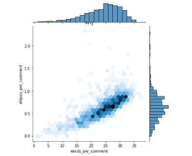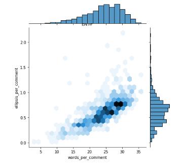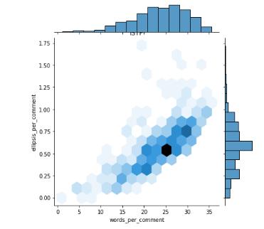 Here we focusing on the correlation variables for the different types of the personality types the Meyer Briggs outlineincomparisontotheword’scommentsandellipses percommenttypewillyieldthehighestcorrelationvalue.