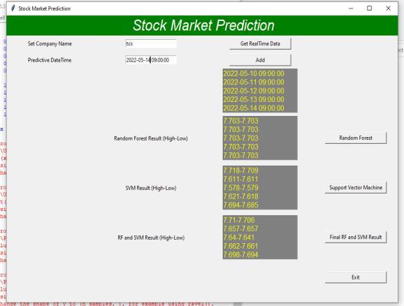 Intheendthisdesktopapplicationwillshowallthedetailed values of HIGH and LOW in Desktop application for that particularperiodoftime.Thisdesktopapplicationcanshow youmultiplevaluesatasingletime,wehavetoaddthedate andtimeforwhichvaluetobepredictedandclickonADD buttonandafterapplyingboththealgorithmswegotallthe valueinamoment.Asampleofthisisshownbelowinthe image