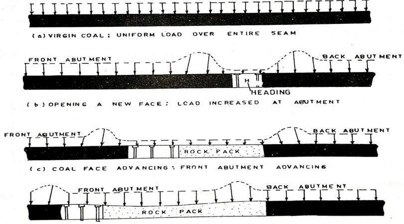 During thedrivage ofheadingsin theadvance oflongwall face, it is observed that the roof strata gets fractured to a certain distance ahead of the coal faces at a considerable distancestratummovementtakesplaceaheadoffracturing. Theabutmentloadaheadofthefacecreatessomebumps, tightening,minorsinkingandsomebulging.Theformation ofacuteangleswiththecoalfacesidewithcoalribsleft,the faceabutmentpressuregetsinvadedatagreaterdistanceat coalribs.Whentheanglebecomesgreaterthan900,thisgets displaced near to the coal ribs. The position of back abutmentandeventheirexistenceisapointofcontroversy, someresearchersbelievestheexistenceofbackabutment whileothersinthepresenceofpressurearch.Thedifferent roofbedsbendsbydifferentamountsbecauseofhavingthe propertiesofyoung’smodulusofelasticityandtheformation ofcavitiestakesplace,knownasWeber’scavity.Thelineof increasedpressureinthistheoryisknownasPressureArch, pressuredome,orPressureellipse.