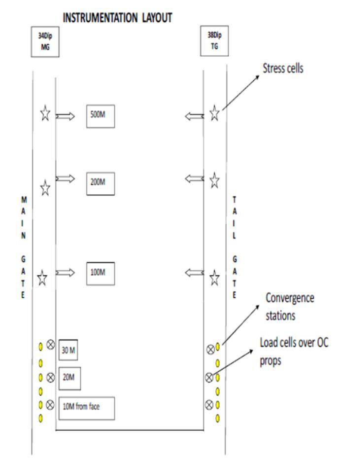 Aim is to understand the geo mechanical behavior of the stratainthegateroadsandintheface.Theseobservations wereaimedatmeasuringthelocationandmagnitudeofthe front abutment, and the deformation of the strata surroundingthegateroads,andloadonsupportsaheadof thelongwallface.Fourvibratingwiretypestresscellswere installed, a continuous convergence recorders and convergencepoints,andloadcellswereinstalledintheTail Gate and Main Gate. The location of these instruments is showninFigure4.
