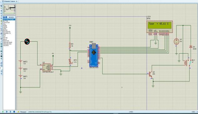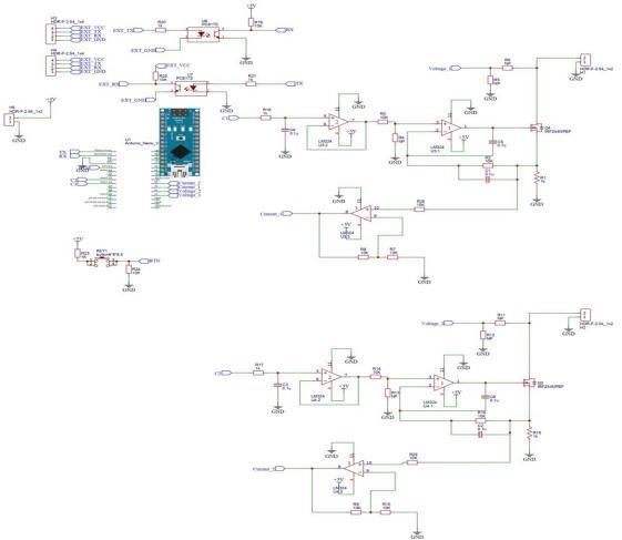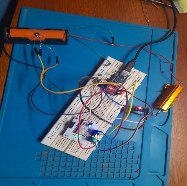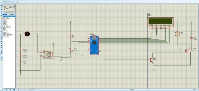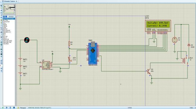 The circuit was simulated in proteus along with anACS712current sensor and a 10k NTC thermistor. The voltage was measured directly bythe A0pinoftheArduino Nano Microcontroller, currentbytheA1pinandtemperaturebytheA2 pin.Insimulationonlywe’veincludedarelaycircuitforprotection,whichwouldnotbenecessaryinthepracticalhardware.