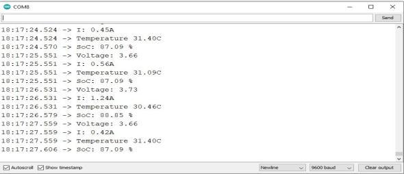 WewillalsodisplaytheresultsontheArduinoserialmonitorbeforeuploadingthemtothecloudserverviaan API.Over theUARTline,thesystemcommunicated withan BOLT module and transmitted data (voltage, temperature,current, SoC, and operating status) to a far off server. Simultaneously, a command infrastructure has been developed that may stop charginganddischargingfromtheremoteserverwhennecessary.ThisfunctionalsoaddsanIoTcapabilitytothesystem. the info that the battery management system sends to the remote server provides information about the system's supply and allows the balancing function to be evaluated. This IoT feature also allows you to regulate load output and considerthechargingprocess.