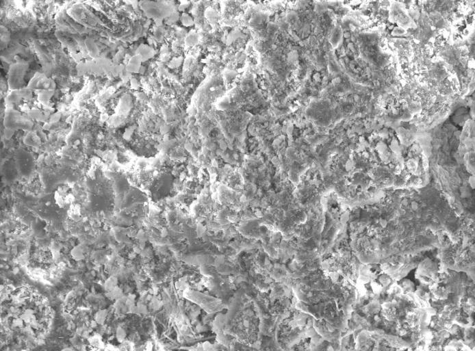From Micrograph Figure, it shows again two major features. Firstly, the number of voids in the mix has significantlyreducedthanabovefigureandsecondly,theC S Hgelformationisbetter,andwhichaddsstrength.